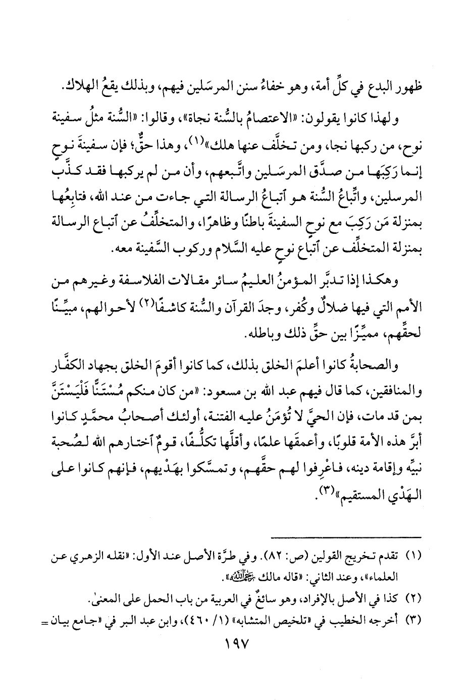 ولهذا كانوا يقولون الاعتصامُ بالسُّنة نجاة وقالوا السُّنة مثلُ سفينة نوح من ركبها نجا ومن تخلَّف عنها هلك 1 وهذا حقٌّ فإن سفينةَ نوحٍ إنما رَكِبَها من صدَّق المرسَلين واتَّبعهم وأن من لم يركبها فقد كذَّب المرسلين واتِّباعُ السُّنة هو اتباعُ الرسالة التي جاءت من عند الله فتابِعُها بمنزلة مَن رَكِبَ مع نوحٍ السفينةَ باطنًا وظاهرًا والمتخلِّفُ عن اتباع الرسالة بمنزلة المتخلِّف عن اتباع نوحٍ عليه السَّلام وركوب السَّفينة معه.