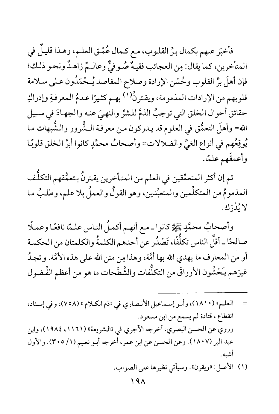 فأخبَر عنهم بكمال برِّ القلوب مع كمال عُمْق العلم وهذا قليلٌ في المتأخرين كما يقال مِن العجائب فقيهٌ صُوفيٌّ وعالمٌ زاهدٌ ونحو ذلك فإن أهلَ برِّ القلوب وحُسْن الإرادة وصلاح المقاصد يُحْمَدُون على سلامة قلوبهم من الإرادات المذمومة ويقترنُ 1 بهم كثيرًا عدمُ المعرفةِ وإدراكِ حقائق أحوال الخلق التي توجبُ الذمَّ للشرِّ والنهيَ عنه والجهادَ في سبيل الله وأهلَ التعمُّق في العلوم قد يدركون من معرفة الشُّرور والشُّبهات ما يُوقِعُهم في أنواع الغيِّ والضلالات وأصحابُ محمَّدٍ كانوا أبرَّ الخلق قلوبًا وأعمقَهم علمًا.