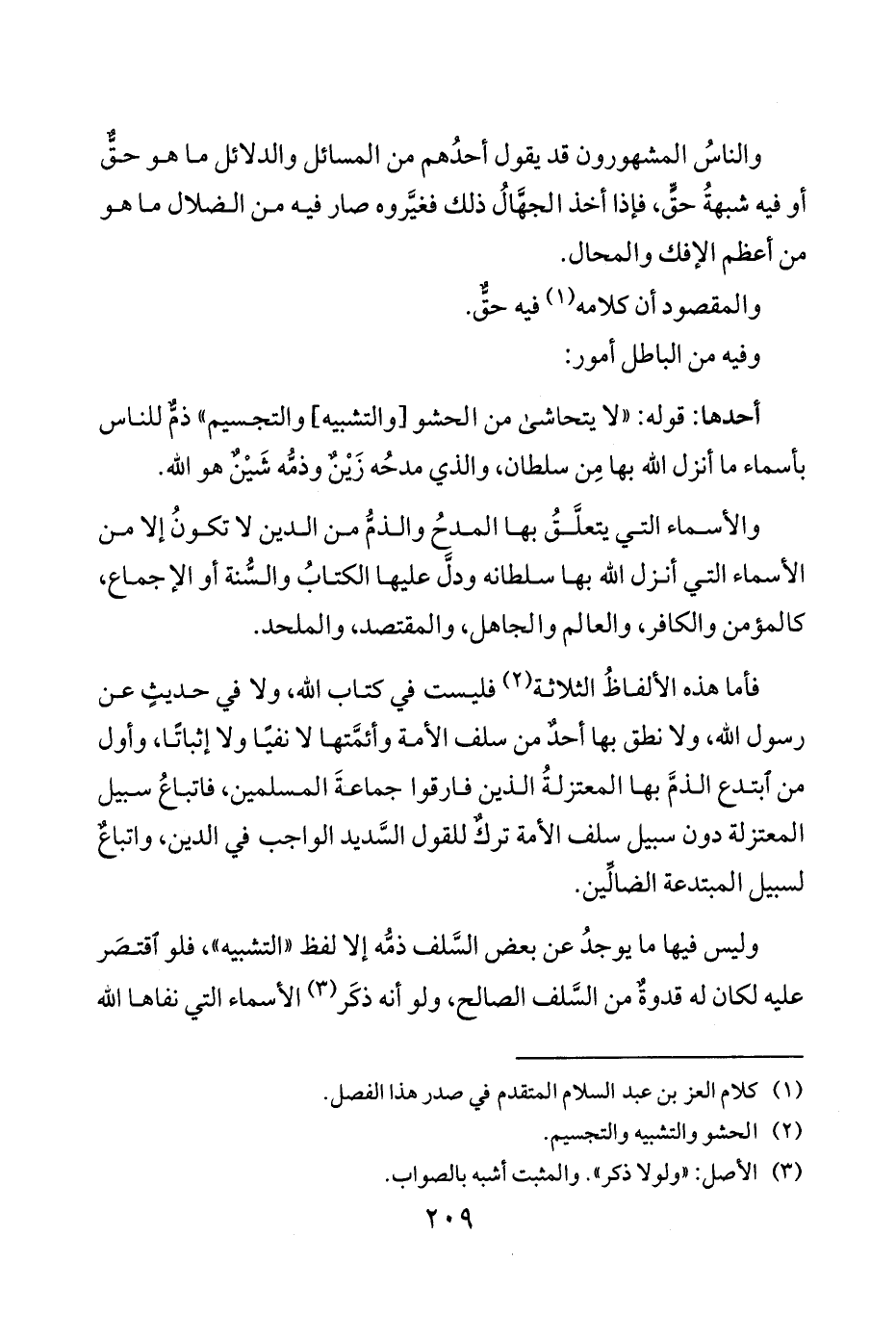 وليس فيها ما يوجدُ عن بعض السَّلف ذمُّه إلا لفظ التشبيه فلو اقتصَر عليه لكان له قدوةٌ من السلف الصالح ولو أنه ذكَر 3 الأسماء التي نفاها الله