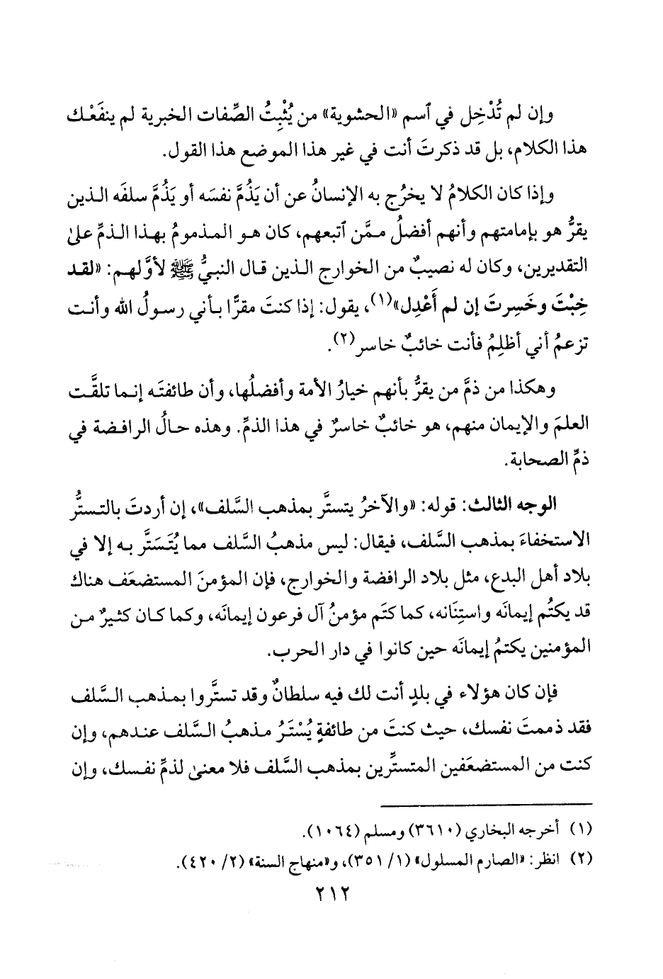 فإن كان هؤلاء في بلدٍ أنت لك فيه سلطانٌ وقد تستَّروا بمذهب السَّلف فقد ذممتَ نفسك حيث كنتَ من طائفةٍ يُسْتَرُ مذهبُ السَّلف عندهم وإن كنت من المستضعَفين المتستِّرين بمذهب السَّلف فلا معنى لذمِّ نفسك وإن
