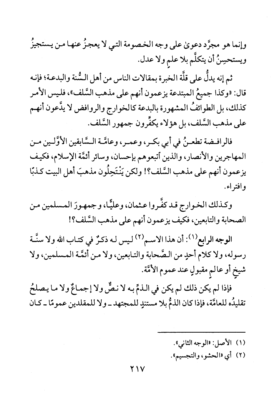 وكذلك الخوارج قد كفَّروا عثمان وعليًّا وجمهورَ المسلمين من الصحابة والتابعين فكيف يزعمون أنهم على مذهب السَّلف.