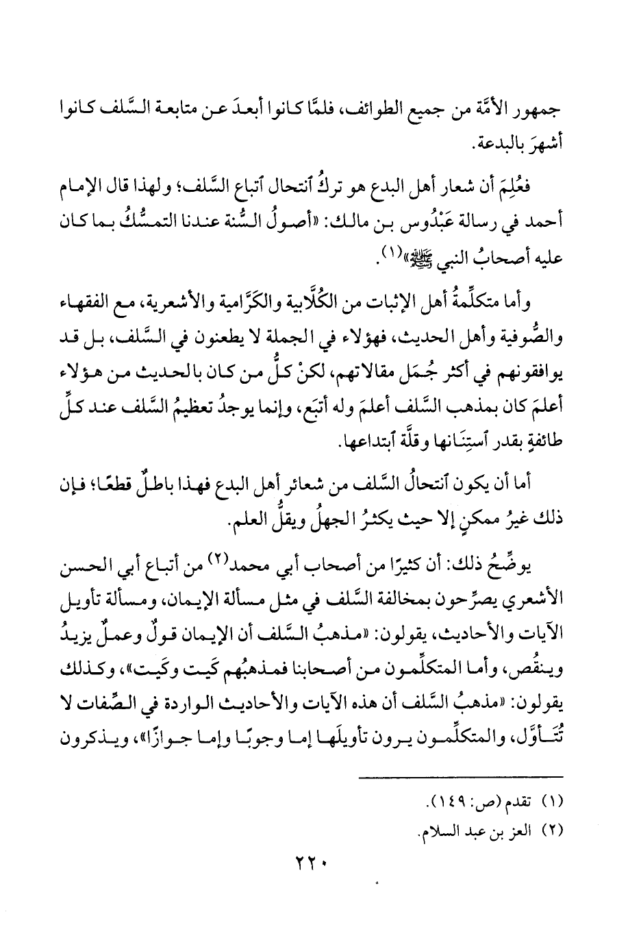 فعُلِمَ أن شعار أهل البدع هو تركُ انتحال اتباع السَّلف ولهذا قال الإمام أحمد في رسالة عَبْدُوس بن مالك أصولُ السُّنة عندنا التمسُّكُ بما كان عليه أصحابُ النبي صلى الله عليه وسلم 1.