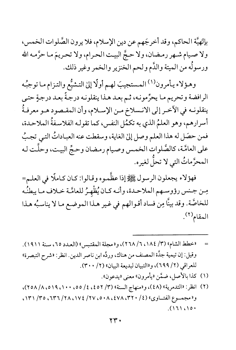 فهؤلاء يجعلون الرسول صلى الله عليه وسلم إذا عظَّموه وقالوا كان كاملًا في العلم مِن جنس رؤوسهم الملاحدة وأنه كان يُظْهِرُ للعامَّة خلاف ما يبطنُه للخاصَّة وقد بينَّا مِن فساد أقوالهم في غير هذا الموضع ما لا يناسبُه هذا المقام 2.
