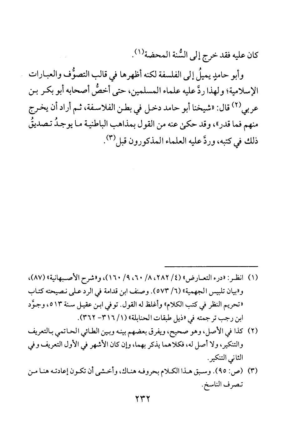 وأبو حامدٍ يميلُ إلى الفلسفة لكنه أظهرها في قالب التصوُّف والعبارات الإسلامية ولهذا ردَّ عليه علماء المسلمين حتى أخصُّ أصحابه أبو بكر بن عربي 2 قال شيخنا أبو حامد دخل في بطن الفلاسفة ثم أراد أن يخرج منهم فما قدر وقد حكى عنه من القول بمذاهب الباطنية ما يوجدُ تصديقُ ذلك في كتبه وردَّ عليه العلماء المذكورون قبل 3.