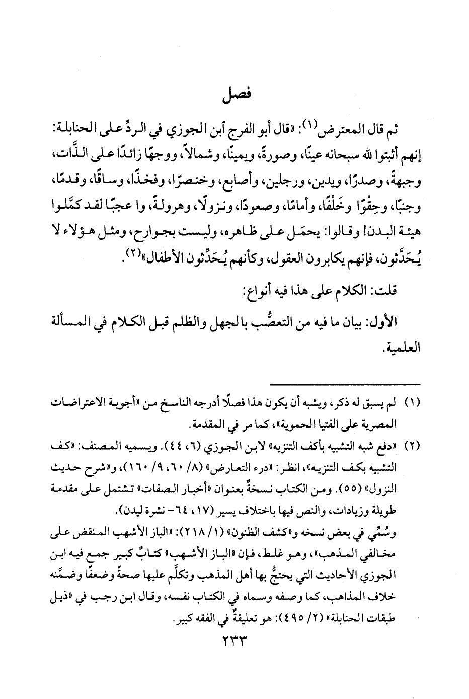ثم قال المعترض 1 قال أبو الفرج ابن الجوزي في الردِّ على الحنابلة إنهم أثبتوا لله سبحانه عينًا وصورةً ويمينًا وشمالًا ووجهًا زائدًا على الذَّات وجبهةً وصدرًا ويدين ورجلين وأصابع وخنصرًا وفخذًا وساقًا وقدمًا وجنبًا وحِقْوًا وخَلْفًا وأمامًا وصعودًا ونزولًا وهرولةً وا عجبًا لقد كمَّلوا هيئة البدن وقالوا يحمَل على ظاهره وليست بجوارح ومثل هؤلاء لا يُحَدِّثون فإنهم يكابرون العقول وكأنهم يُحَدِّثون الأطفال 2.