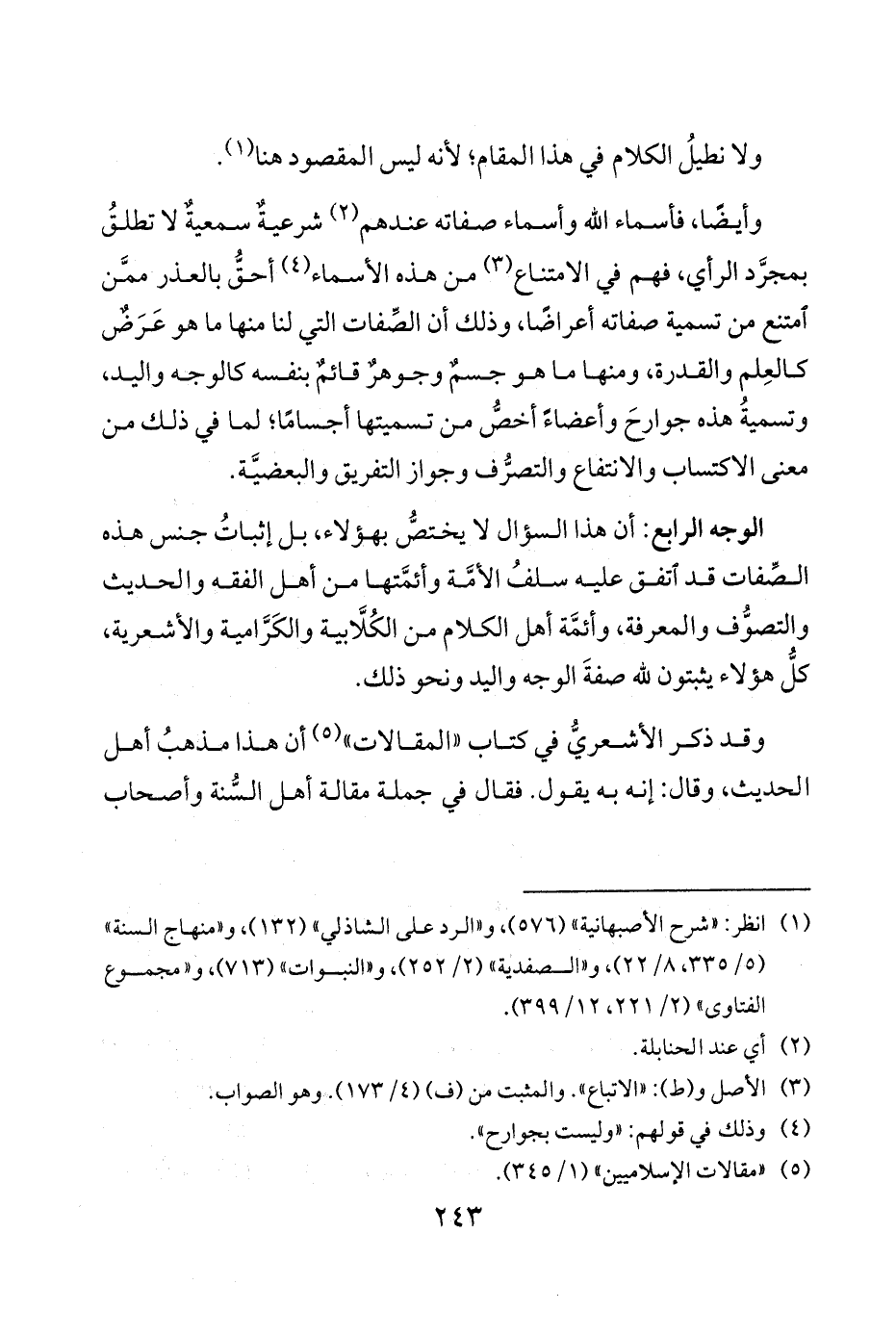 الوجه الرابع أن هذا السؤال لا يختصُّ بهؤلاء بل إثباتُ جنس هذه الصِّفات قد اتفق عليه سلفُ الأمَّة وأئمَّتها من أهل الفقه والحديث والتصوُّف والمعرفة وأئمَّة أهل الكلام من الكُلَّابية والكَرَّامية والأشعرية كلُّ هؤلاء يثبتون لله صفةَ الوجه واليد ونحو ذلك.