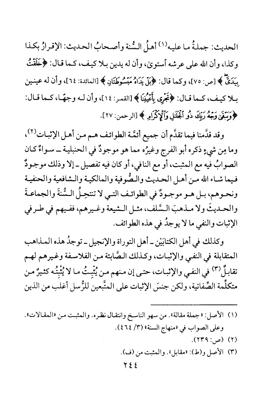 وقد قدَّمنا فيما تقدَّم أن جميع أئمَّة الطوائف هم من أهل الإثبات 2 وما مِن شيءٍ ذكره أبو الفرج وغيرُه مما هو موجودٌ في الحنبلية سواءٌ كان الصوابُ فيه مع المثبت أو مع النافي أو كان فيه تفصيل إلا وذلك موجودٌ فيما شاء الله من أهل الحديث والصُّوفية والمالكية والشافعية والحنفية ونحوهم بل هو موجودٌ في الطوائف التي لا تنتحِلُ السُّنةَ والجماعةَ والحديثَ ولا مذهبَ السَّلف مثل الشيعة وغيرهم ففيهم في طرفي الإثبات والنفي ما لا يوجدُ في هذه الطوائف.