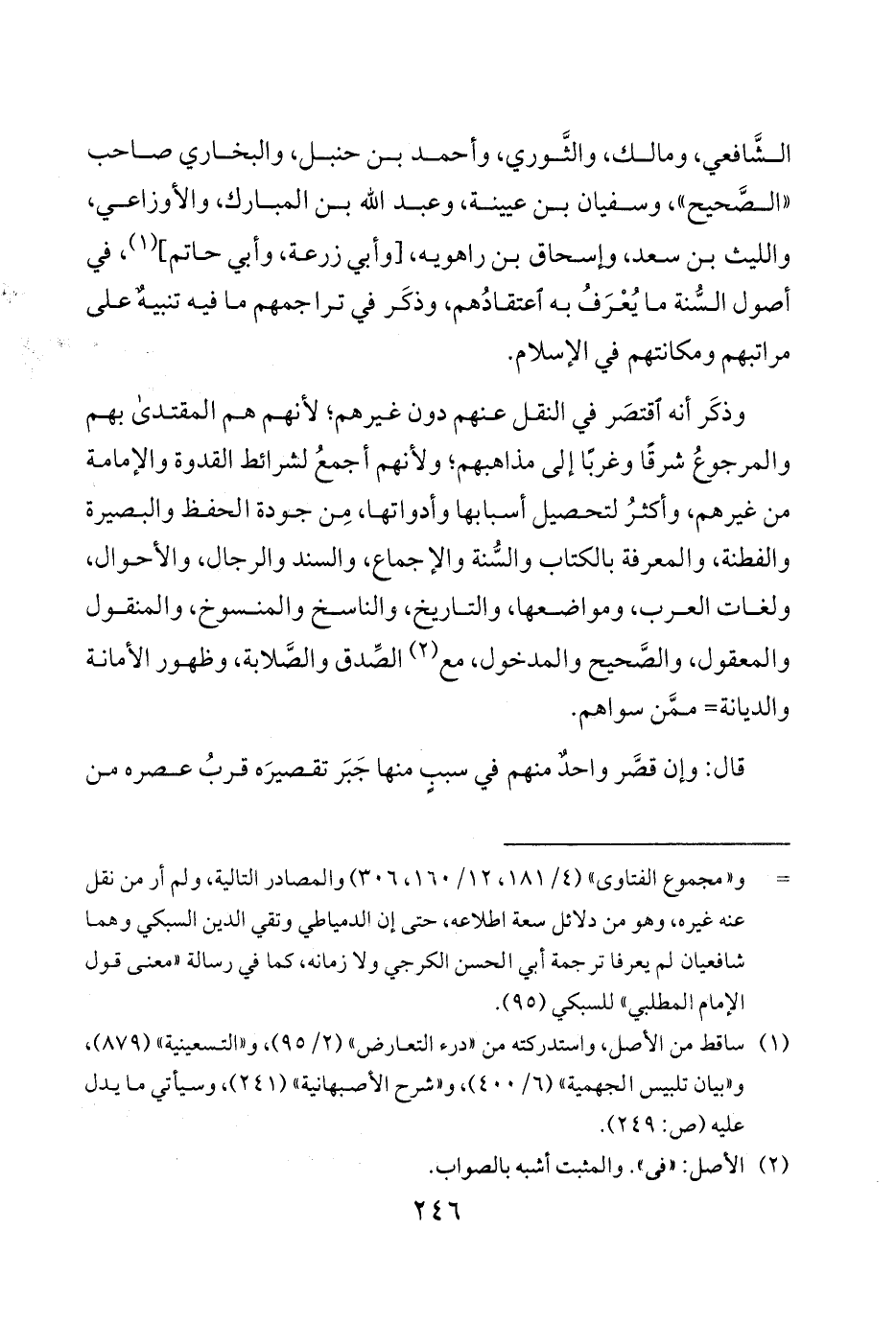 الشَّافعي ومالك والثَّوري وأحمد بن حنبل والبخاري صاحب الصَّحيح وسفيان بن عيينة وعبد الله بن المبارك والأوزاعي والليث بن سعد وإسحاق بن راهويه [وأبي زرعة وأبي حاتم] 1 في أصول السُّنة ما يُعْرَفُ به اعتقادُهم وذكَر في تراجمهم ما فيه تنبيهٌ على مراتبهم ومكانتهم في الإسلام.