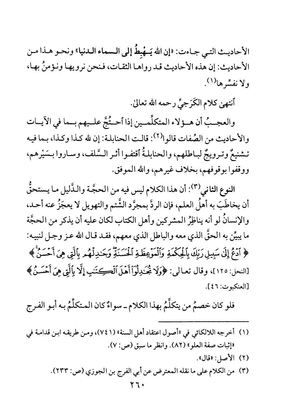 والعجبُ أن هؤلاء المتكلِّمين إذا احتُجَّ عليهم بما في الآيات والأحاديث من الصِّفات قالوا 2 قالت الحنابلة إن لله كذا وكذا بما فيه تشنيعٌ وترويجٌ لباطلهم والحنابلةُ اقتفوا أثر السَّلف وساروا بسَيْرهم ووقفوا بوقوفهم بخلاف غيرهم والله الموفق.
