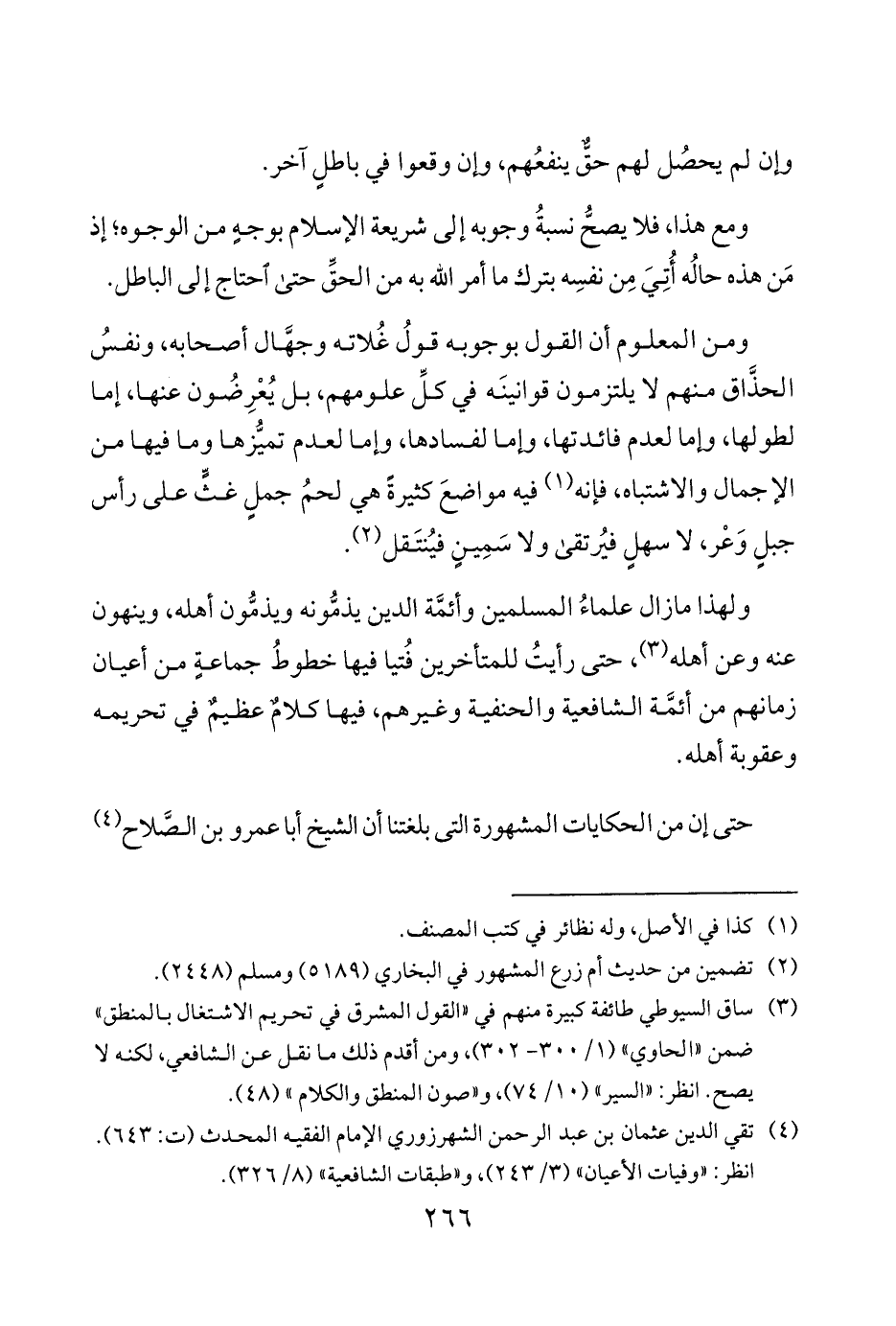 ولهذا ما زال علماءُ المسلمين وأئمَّة الدين يذمُّونه ويذمُّون أهله وينهون عنه وعن أهله 3 حتى رأيتُ للمتأخرين فُتيا فيها خطوطُ جماعةٍ من أعيان زمانهم من أئمَّة الشافعية والحنفية وغيرهم فيها كلامٌ عظيمٌ في تحريمه وعقوبة أهله.