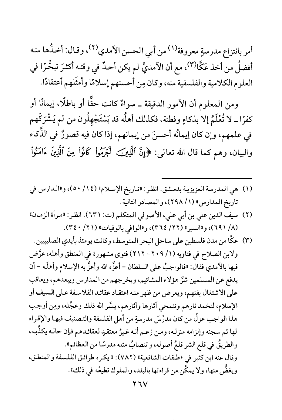 أمر بانتزاع مدرسةٍ معروفة 1 من أبي الحسن الآمدي 2 وقال أخذُها منه أفضلُ من أخذ عَكَّا 3 مع أن الآمديَّ لم يكن أحدٌ في وقته أكثرَ تبحُّرًا في العلوم الكلامية والفلسفية منه وكان مِن أحسنهم إسلامًا وأمثَلهم اعتقادًا.
