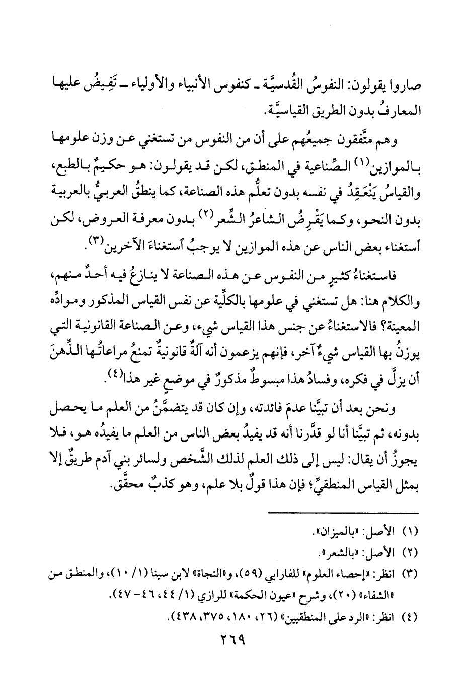 فاستغناءُ كثيرٍ من النفوس عن هذه الصناعة لا ينازعُ فيه أحدٌ منهم والكلام هنا هل تستغني في علومها بالكلِّية عن نفس القياس المذكور وموادِّه المعينة فالاستغناءُ عن جنس هذا القياس شيء وعن الصناعة القانونية التي يوزنُ بها القياس شيءٌ آخر فإنهم يزعمون أنه آلةٌ قانونيةٌ تمنعُ مراعاتُها الذِّهنَ أن يزلَّ في فكره وفسادُ هذا مبسوطٌ مذكورٌ في موضعٍ غير هذا 4.