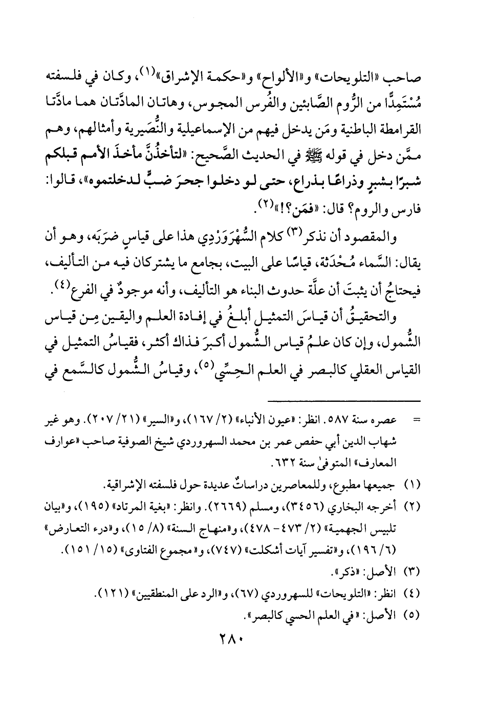 صاحب التلويحات والألواح وحكمة الإشراق 1 وكان في فلسفته مُسْتَمِدًّا من الرُّوم الصَّابئين والفُرس المجوس وهاتان المادَّتان هما مادَّتا القرامطة الباطنية وَمن يدخل فيهم من الإسماعيلية والنُّصَيرية وأمثالهم وهم ممَّن دخل في قوله صلى الله عليه وسلم في الحديث الصَّحيح «لتأخذُنَّ مأخذَ الأمم قبلكم شبرًا بشبرٍ وذراعًا بذراع حتى لو دخلوا جحرَ ضبٍّ لدخلتموه» قالوا فارس والروم قال «فمن» 2.