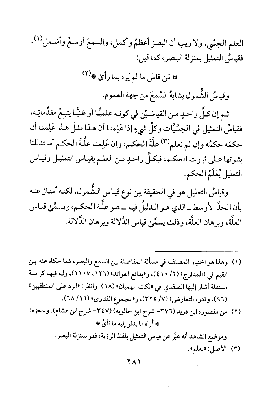 العلم الحِسِّي ولا ريب أن البصرَ أعظمُ وأكمل والسمعَ أوسعُ وأشمل 1 فقياسُ التمثيل بمنزلة البصر كما قيل: