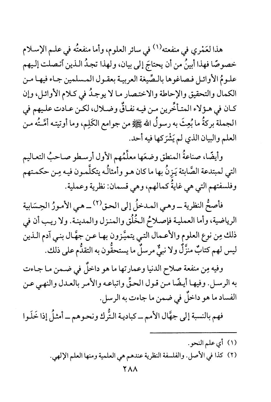 فأصحُّ النظرية وهي المدخلُ إلى الحق 2 هي الأمورُ الحِسَابية الرياضية وأما العملية فإصلاحُ الخُلُق والمنزل والمدينة ولا ريب أن في ذلك مِن نوع العلوم والأعمال الذي يتميَّزون بها عن جهَّال بني آدم الذين ليس لهم كتابٌ منزَّلٌ ولا نبيٌّ مرسلٌ ما يستحقُّون به التقدُّم على ذلك.