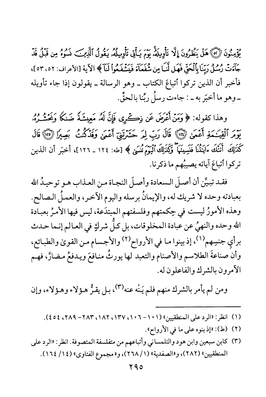 فقد تبيَّن أن أصلَ السعادة وأصلَ النجاة من العذاب هو توحيدُ الله بعبادته وحده لا شريك له والإيمانُ برسله واليوم الآخر والعملُ الصالح وهذه الأمورُ ليست في حِكمتهم وفلسفتهم المبتدَعة ليس فيها الأمرُ بعبادة الله وحده والنهيُ عن عبادة المخلوقات بل كلُّ شركٍ في العالم إنما حدث برأيِ جنسِهم 1 إذ بينوا ما في الأرواح 2 والأجسام من القوى والطبائع وأن صناعةَ الطلاسم والأصنام والتعبد لها يورثُ منافعَ ويدفعُ مضارَّ فهم الآمرون بالشرك والفاعلون له.