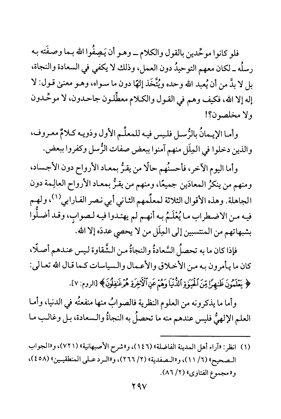 وأما اليوم الآخر فأحسنُهم حالًا من يقرُّ بمعاد الأرواح دون الأجساد ومنهم من ينكرُ المعادَين جميعًا ومنهم من يقرُّ بمعاد الأرواح العالِمة دون الجاهلة وهذه الأقوال الثلاثة لمعلِّمهم الثاني أبي نصر الفارابي 1 ولهم فيه من الاضطراب ما يُعْلَمُ به أنهم لم يهتدوا فيه لصوابٍ وقد أضلُّوا بشبهاتهم من المنتسبين إلى المِلَل من لا يحصي عددَه إلا الله.
