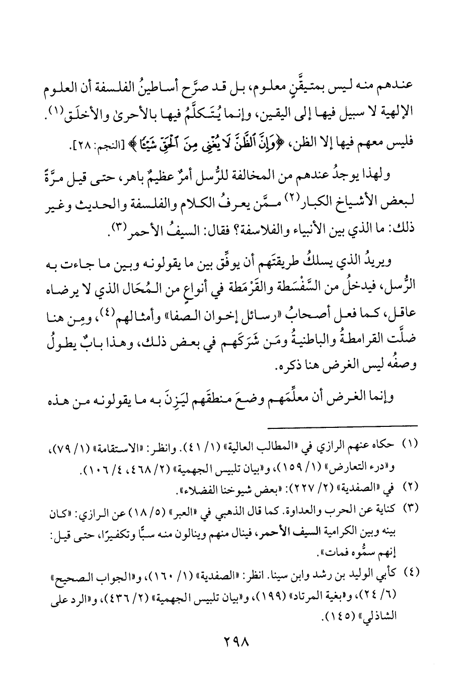 ويريدُ الذي يسلكُ طريقتَهم يريد أن يوفِّق بين ما يقولونه وبين ما جاءت به الرُّسل فيدخلُ من السَّفْسَطة والقَرْمَطة في أنواعٍ من المُحَال الذي لا يرضاه عاقل كما فعل أصحابُ رسائل إخوان الصفا وأمثالهم 4 ومِن هنا ضلَّت القرامطةُ والباطنيةُ ومَن شَرَكَهم في بعض ذلك وهذا بابٌ يطولُ وصفه ليس الغرض هنا ذكره.