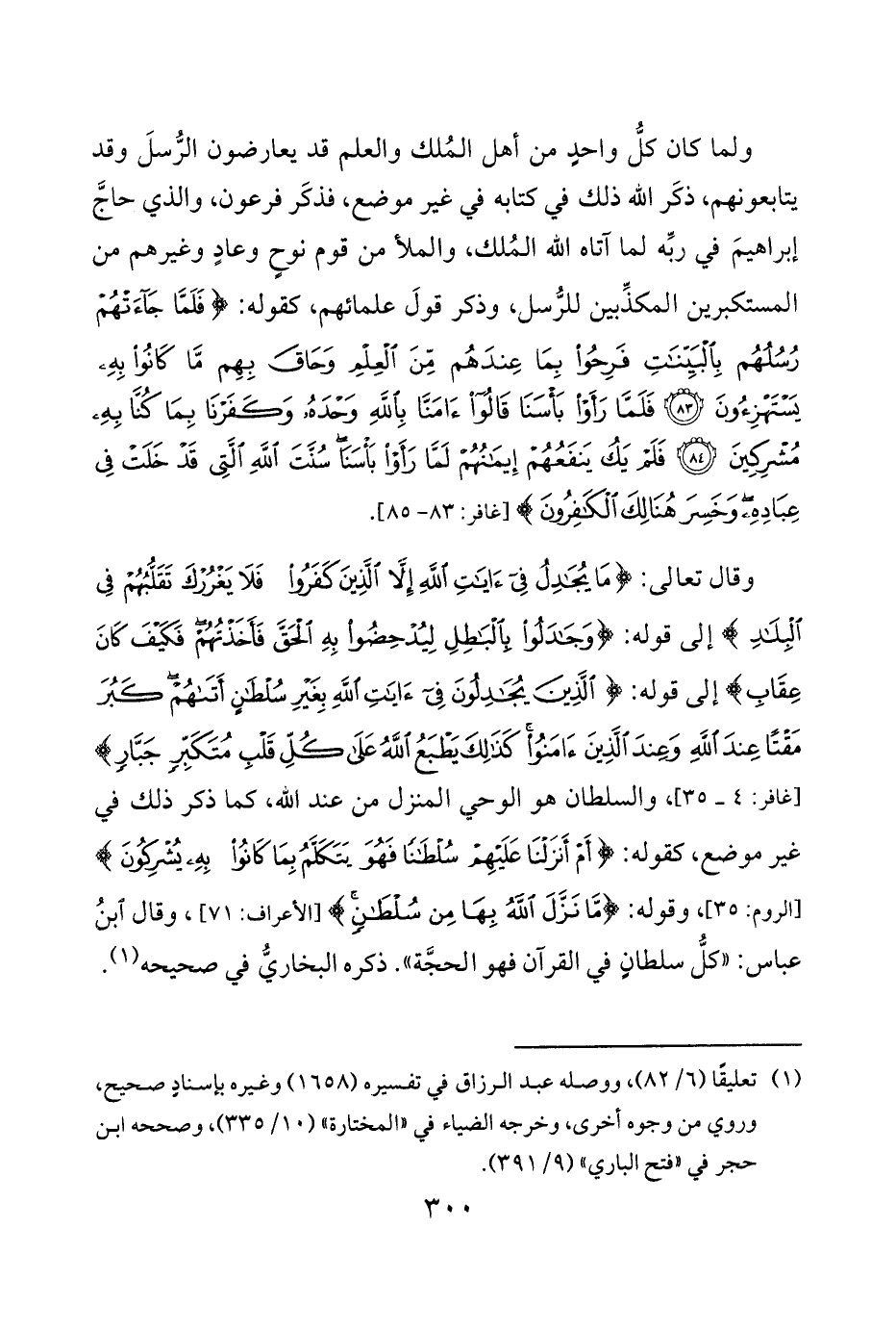 وقال تعالى {مَا يُجَادِلُ فِي آيَاتِ اللهِ إِلَّا الَّذِينَ كَفَرُوا فَلَا يَغْرُرْكَ تَقَلُّبُهُمْ فِي الْبِلَادِ} إلى قوله {وَجَادَلُوا بِالْبَاطِلِ لِيُدْحِضُوا بِهِ الْحَقَّ فَأَخَذْتُهُمْ فَكَيْفَ كَانَ عِقَابِ} إلى قوله {الَّذِينَ يُجَادِلُونَ فِي آيَاتِ اللهِ بِغَيْرِ سُلْطَانٍ أَتَاهُمْ كَبُرَ مَقْتًا عِنْدَ اللهِ وَعِنْدَ الَّذِينَ آمَنُوا كَذَلِكَ يَطْبَعُ اللهُ عَلَى كُلِّ قَلْبِ مُتَكَبِّرٍ جَبَّارٍ} والسلطان هو الوحي المنزل من عند الله كما ذكر ذلك في غير موضع كقوله {أَمْ أَنْزَلْنَا عَلَيْهِمْ سُلْطَانًا فَهُوَ يَتَكَلَّمُ بِمَا كَانُوا بِهِ يُشْرِكُونَ} وقوله {مَا نَزَّلَ اللهُ بِهَا مِنْ سُلْطَانٍ} وقال ابنُ عباس كلُّ سلطانٍ في القرآن فهو الحجَّة ذكره البخاريُّ في صحيحه 1.