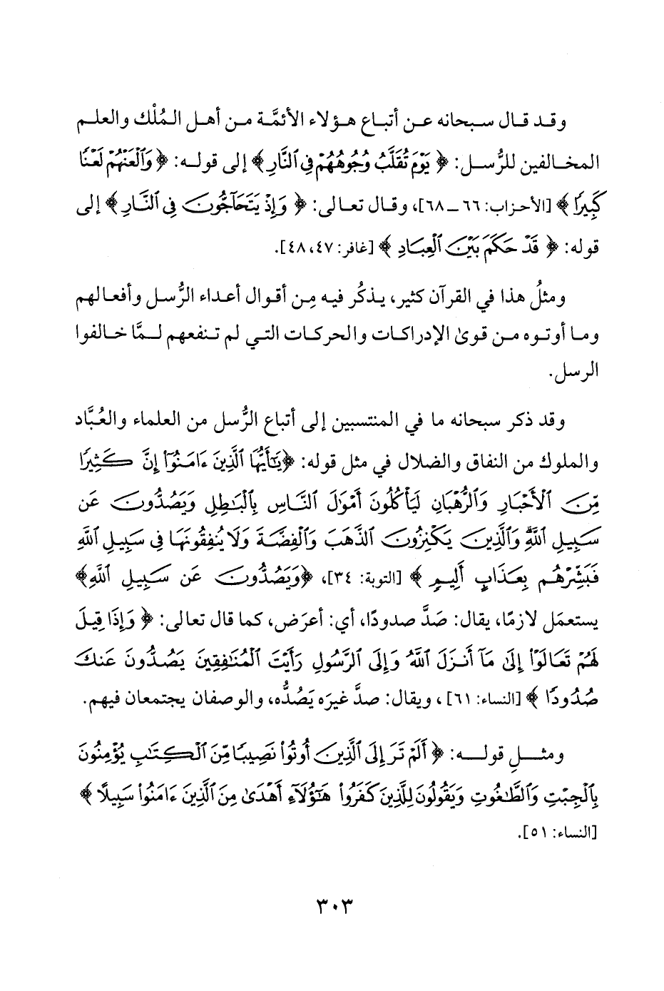 وقد ذكر الله سبحانه ما في المنتسبين إلى أتباع الرُّسل من العلماء والعُبَّاد والملوك من النفاق والضلال في مثل قوله {يَاأَيُّهَا الَّذِينَ آمَنُوا إِنَّ كَثِيرًا مِنَ الْأَحْبَارِ وَالرُّهْبَانِ لَيَأْكُلُونَ أَمْوَالَ النَّاسِ بِالْبَاطِلِ وَيَصُدُّونَ عَنْ سَبِيلِ اللهِ وَالَّذِينَ يَكْنِزُونَ الذَّهَبَ وَالْفِضَّةَ وَلَا يُنْفِقُونَهَا فِي سَبِيلِ اللهِ فَبَشِّرْهُمْ بِعَذَابٍ أَلِيمٍ} {وَيَصُدُّونَ عَنْ سَبِيلِ اللهِ} يستعمَل لازمًا يقال صَدَّ صدودًا أي أعرَض كما قال تعالى {وَإِذَا قِيلَ لَهُمْ تَعَالَوْا إِلَى مَا أَنْزَلَ اللهُ وَإِلَى الرَّسُولِ رَأَيْتَ الْمُنَافِقِينَ يَصُدُّونَ عَنْكَ صُدُودًا} ويقال صدَّ غيرَه يَصُدُّه والوصفان يجتمعان فيهم.