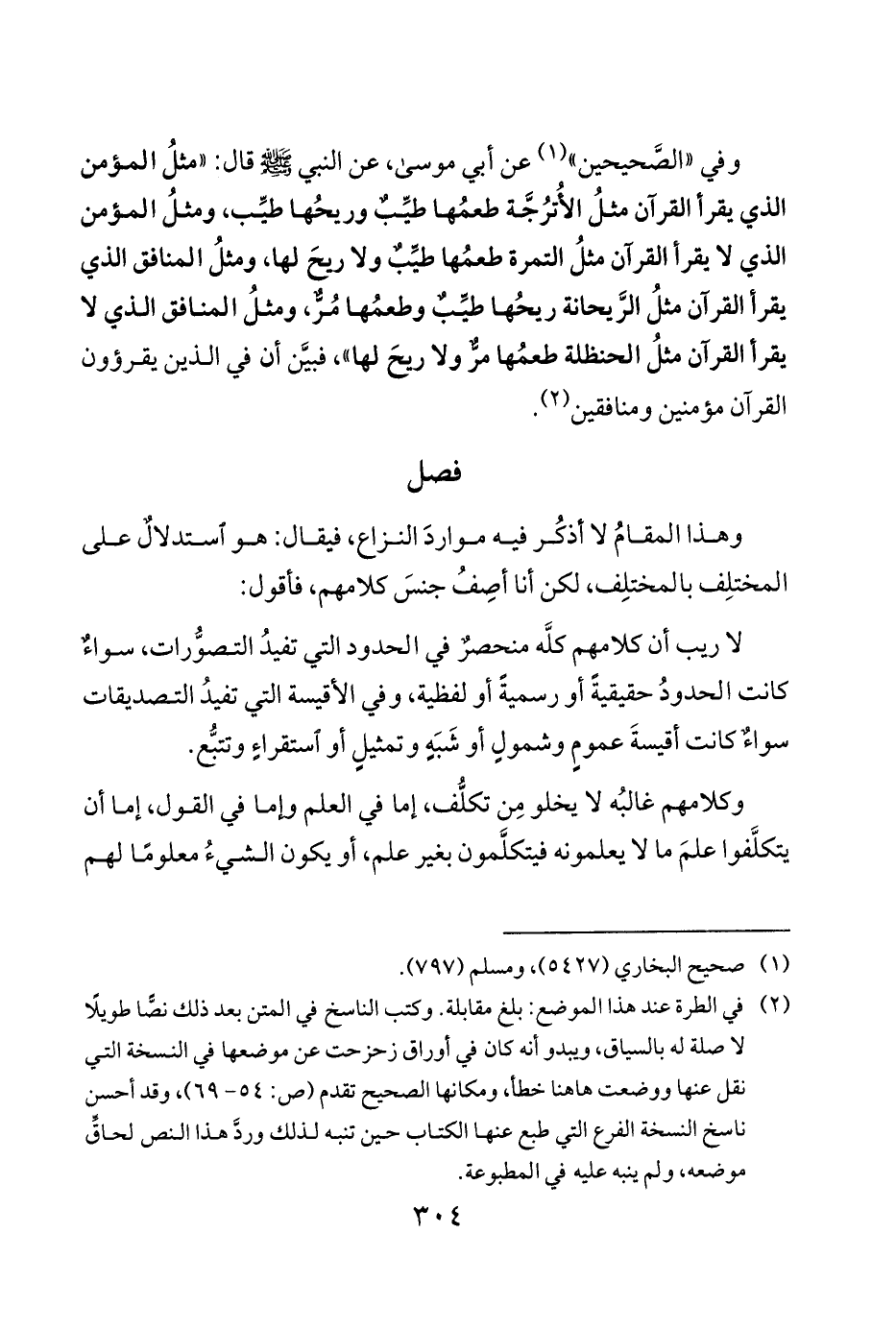 وفي الصَّحيحين 1 عن أبي موسى عن النبي صلى الله عليه وسلم قال «مثلُ المؤمن الذي يقرأ القرآن مثلُ الأُترُجَّة طعمُها طيِّبٌ وريحُها طيِّب ومثلُ المؤمن الذي لا يقرأ القرآن مثلُ التمرة طعمُها طيِّبٌ ولا ريحَ لها ومثلُ المنافق الذي يقرأ القرآن مثلُ الرَّيحانة ريحُها طيِّبٌ وطعمُها مُرٌّ ومثلُ المنافق الذي لا يقرأ القرآن مثلُ الحنظلة طعمُها مرٌّ ولا ريحَ لها» فبيَّن أن في الذين يقرؤون القرآن مؤمنين ومنافقين 2.
