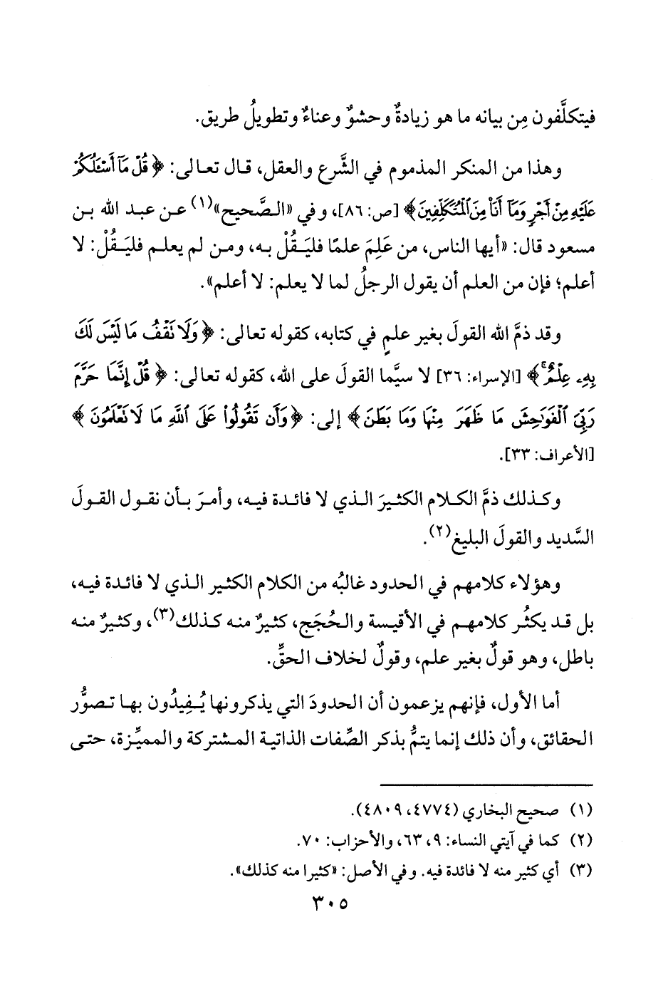 وهؤلاء كلامهم في الحدود غالبُه من الكلام الكثير الذي لا فائدة فيه بل قد يكثُر كلامهم في الأقيسة والحُجَج كثيرٌ منه كذلك 3 وكثيرٌ منه باطل وهو قولٌ بغير علم وقولٌ لخلاف الحقِّ.