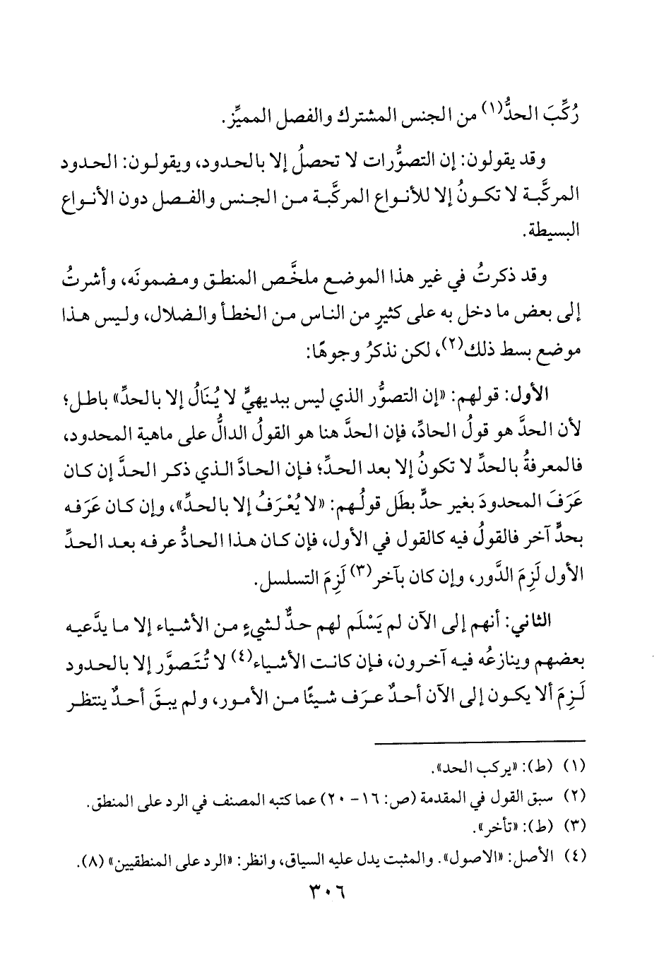الأول قولهم إن التصوُّر الذي ليس ببديهيٍّ لا يُنَالُ إلا بالحدِّ باطل لأن الحدَّ هو قولُ الحادِّ فإن الحدَّ هنا هو القولُ الدالُّ على ماهية المحدود فالمعرفةُ بالحدِّ لا تكونُ إلا بعد الحدِّ فإن الحادَّ الذي ذكر الحدَّ إن كان عَرَفَ المحدودَ بغير حدٍّ بطَل قولُهم لا يُعْرَفُ إلا بالحدِّ وإن كان عَرَفه بحدٍّ آخر فالقولُ فيه كالقول في الأول فإن كان هذا الحادُّ عرفه بعد الحدِّ الأول لَزِمَ الدَّور وإن كان بآخر 3 لَزِمَ التسلسل.