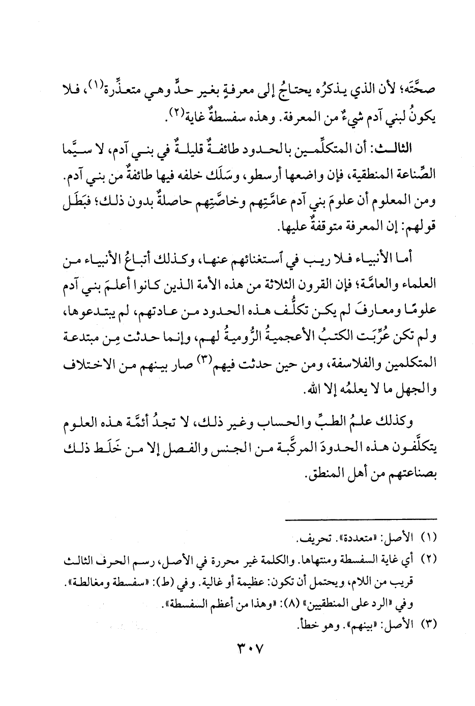 الثالث أن المتكلِّمين بالحدود طائفةٌ قليلةٌ في بني آدم لا سيِّما الصِّناعة المنطقية فإن واضعها أرسطو وسَلَك خلفه فيها طائفةٌ من بني آدم ومن المعلوم أن علومَ بني آدم عامَّتِهم وخاصَّتِهم حاصلةٌ بدون ذلك فبَطَل قولهم إن المعرفة متوقفةٌ عليها.