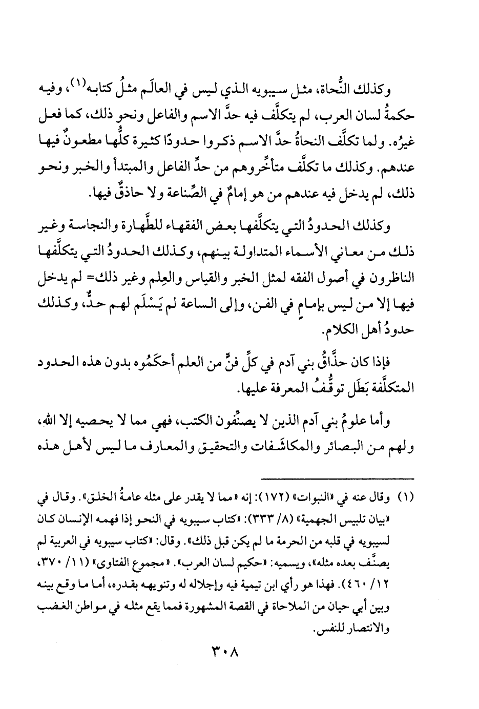 وكذلك النُّحاة مثل سيبويه الذي ليس في العالَم مثلُ كتابه وفيه حكمةُ لسان العرب لم يتكلَّف فيه حدَّ الاسم والفاعل ونحو ذلك كما فعل غيرُه ولما تكلَّف النحاةُ حدَّ الاسم ذكروا حدودًا كثيرة كلُّها مطعونٌ فيها عندهم وكذلك ما تكلَّف متأخِّروهم من حدِّ الفاعل والمبتدأ والخبر ونحو ذلك لم يدخل فيه عندهم من هو إمامٌ في الصِّناعة ولا حاذقٌ فيها.