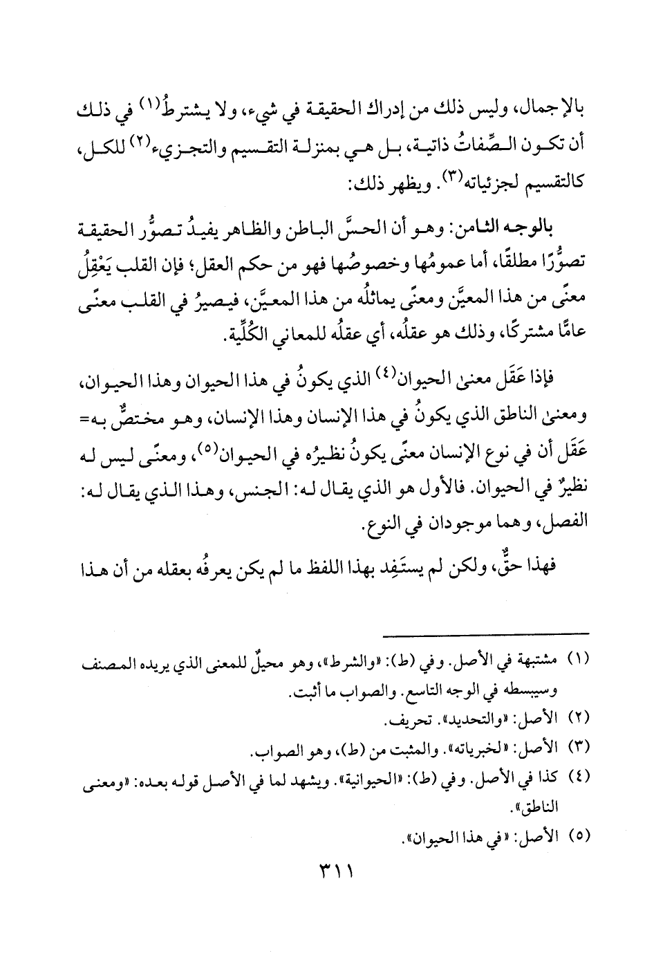 فإذا عَقَل معنى الحيوان 4 الذي يكونُ في هذا الحيوان وهذا الحيوان ومعنى الناطق الذي يكونُ في هذا الإنسان وهذا الإنسان وهو مختصٌّ به عَقَل أن في نوع الإنسان معنًى يكونُ نظيرُه في الحيوان 5 ومعنًى ليس له نظيرٌ في الحيوان فالأول هو الذي يقال له الجنس وهذا الذي يقال له الفصل وهما موجودان في النوع.
