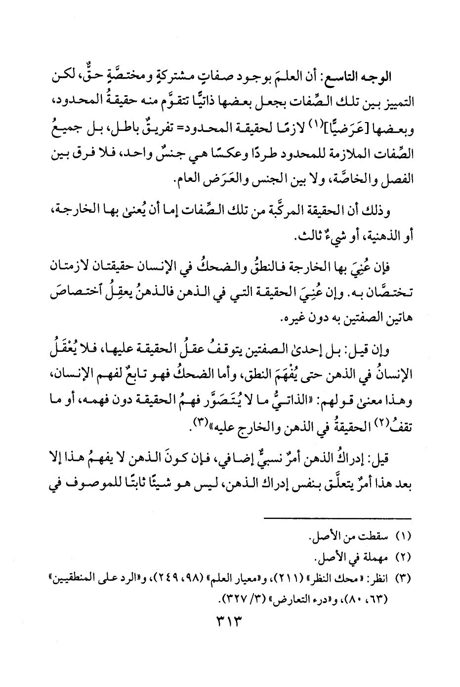 الوجه التاسع أن العلمَ بوجود صفاتٍ مشتركةٍ ومختصَّةٍ حقٌّ لكن التمييز بين تلك الصِّفات بجعل بعضها ذاتيًّا تتقوَّم منه حقيقةُ المحدود وبعضها [عَرَضيًّا] 1 لازمًا لحقيقة المحدود تفريقٌ باطل بل جميعُ الصِّفات الملازمة للمحدود طردًا وعكسًا هي جنسٌ واحد فلا فرق بين الفصل والخاصَّة ولا بين الجنس والعَرَض العام.