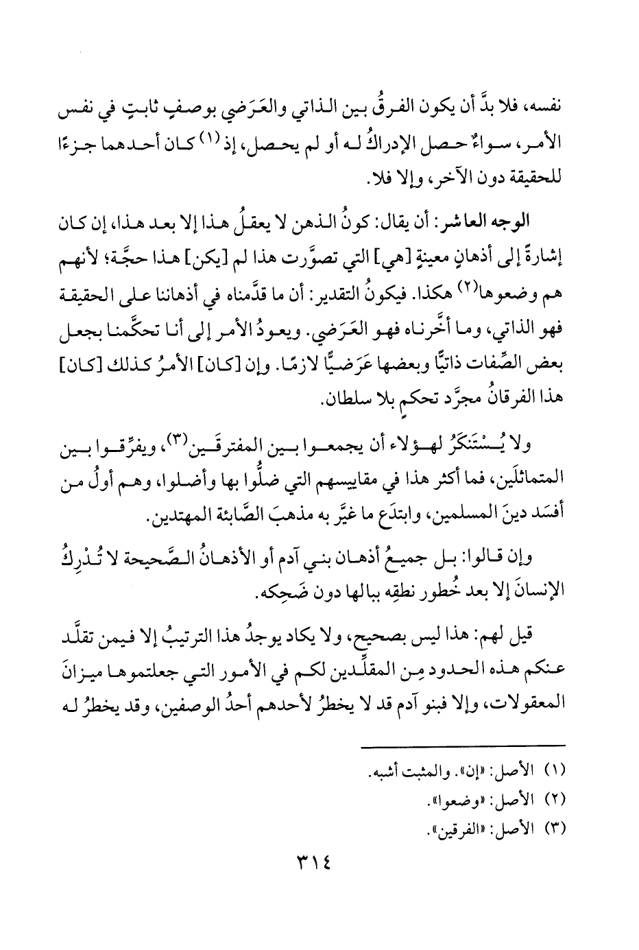 الوجه العاشر أن يقال كونُ الذهن لا يعقلُ هذا إلا بعد هذا إن كان إشارةً إلى أذهانٍ معينةٍ [هي] التي تصورَّت هذا لم [يكن] هذا حجَّة لأنهم هم وضعوها 2 هكذا فيكونُ التقدير أن ما قدَّمناه في أذهاننا على الحقيقة فهو الذاتي وما أخَّرناه فهو العَرَضي ويعودُ الأمر إلى أنا تحكَّمنا بجعل بعض الصِّفات ذاتيًّا وبعضها عَرَضيًّا لازمًا وإن [كان] الأمرُ كذلك [كان] هذا الفرقانُ مجرَّد تحكمٍ بلا سلطان.