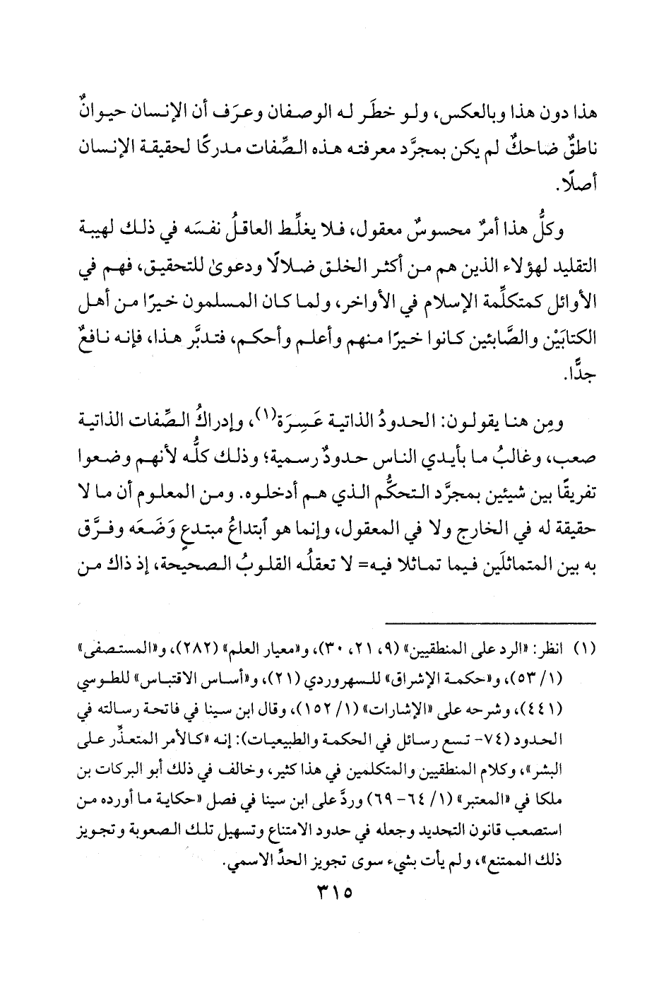 ومِن هنا يقولون الحدودُ الذاتية عَسِرَة 1 وإدراكُ الصِّفات الذاتية صعب وغالبُ ما بأيدي الناس حدودٌ رسمية وذلك كلُّه لأنهم وضعوا تفريقًا بين شيئين بمجرَّد التحكُّم الذي هم أدخلوه ومن المعلوم أن ما لا حقيقة له في الخارج ولا في المعقول وإنما هو ابتداعُ مبتدعٍ وَضَعَه وفرَّق به بين المتماثلَين فيما تماثلا فيه لا تعقلُه القلوبُ الصحيحة إذ ذاك من