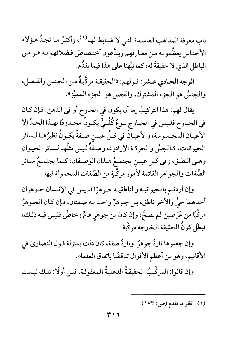 وإن أردتم بالحيوانية والناطقية جوهرًا فليس في الإنسان جوهران أحدهما حيٌّ والآخر ناطق بل جوهرٌ واحد له صفتان فإن كان الجوهرُ مركَّبًا من عَرَضين لم يصحَّ وإن كان من جوهرٍ عامٍّ وخاصٍّ فليس فيه ذلك فبطَل كونُ الحقيقة الخارجة مركَّبة.