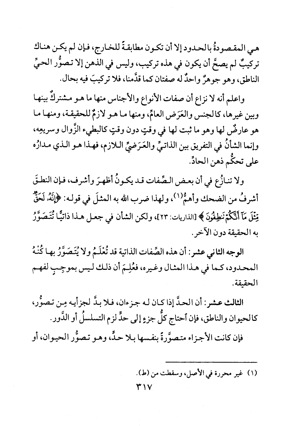 ولا تنازُع في أن بعض الصِّفات قد يكونُ أظهرَ وأشرف فإن النطقَ أشرفُ من الضحك وأهمُّ 1 ولهذا ضرب الله به المثلَ في قوله {إِنَّهُ لَحَقٌّ مِثْلَ مَا أَنَّكُمْ تَنْطِقُونَ} ولكن الشأن في جعل هذا ذاتيًّا تُتَصَوَّرُ به الحقيقة دون الآخر.