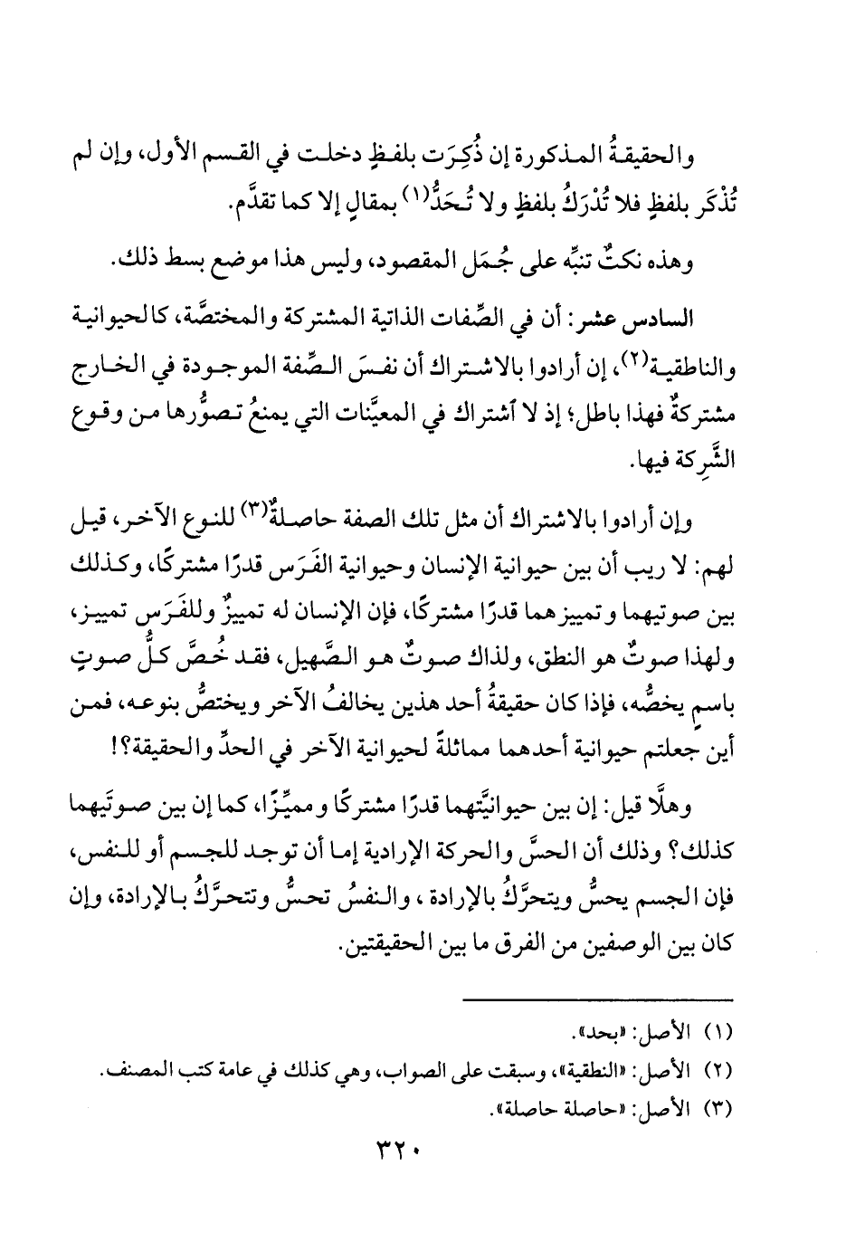 السادس عشر أن في الصِّفات الذاتية المشتركة والمختصَّة كالحيوانية والناطقية 2 إن أرادوا بالاشتراك أن نفسَ الصِّفة الموجودة في الخارج مشتركةٌ فهذا باطل إذ لا اشتراك في المعيَّنات التي يمنعُ تصوُّرها من وقوع الشَّرِكة فيها.