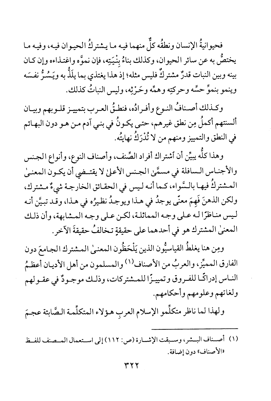ومِن هنا يغلطُ القياسيُّون الذين يَلْحَظُون المعنى المشترك الجامعَ دون الفارق المميِّز والعربُ من الأصناف 1 والمسلمون من أهل الأديان أعظمُ الناس إدراكًا للفروق وتمييزًا للمشتركات وذلك موجودٌ في عقولهم ولغاتهم وعلومهم وأحكامهم.