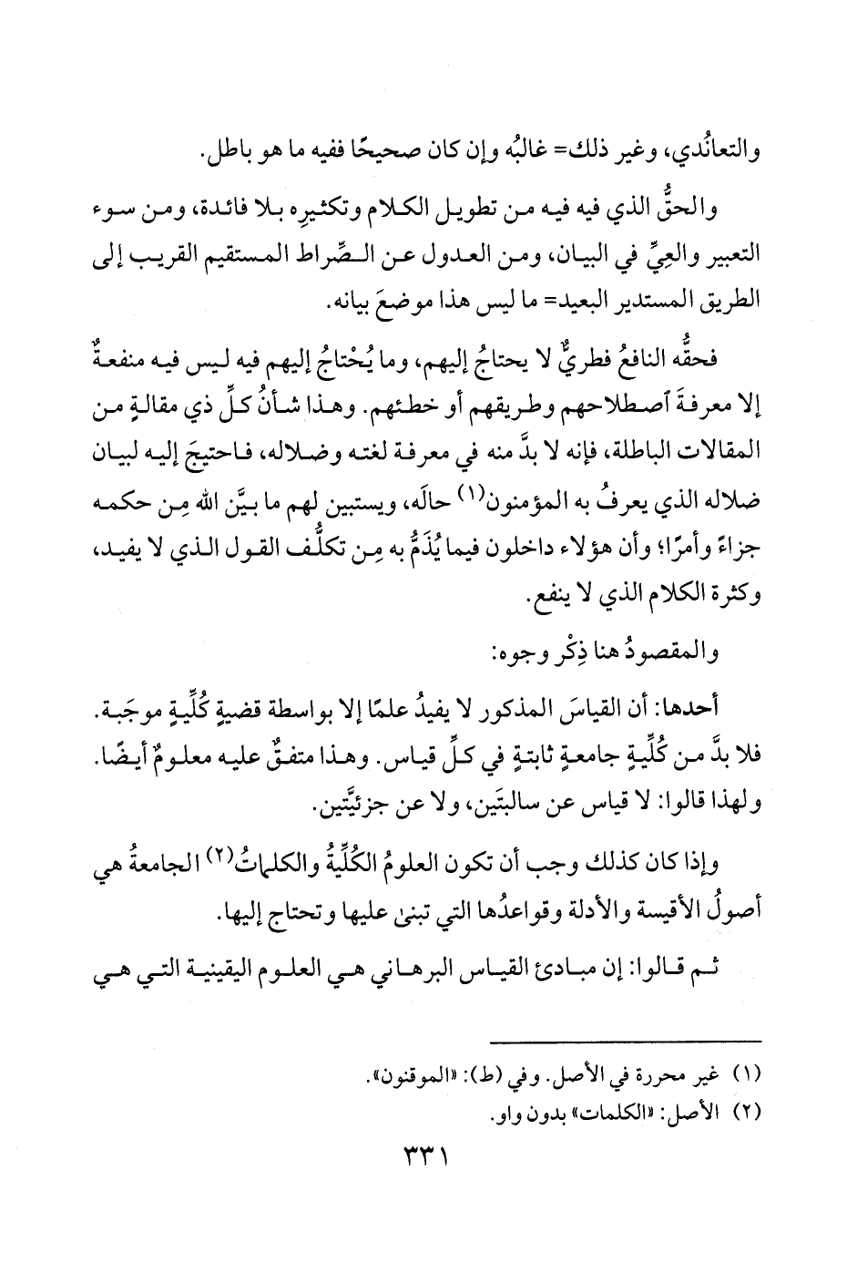 وإذا كان كذلك وجب أن تكون العلومُ الكُلِّيةُ والكلماتُ 2 الجامعةُ هي أصولُ الأقيسة والأدلة وقواعدُها التي تبنى عليها وتحتاج إليها.