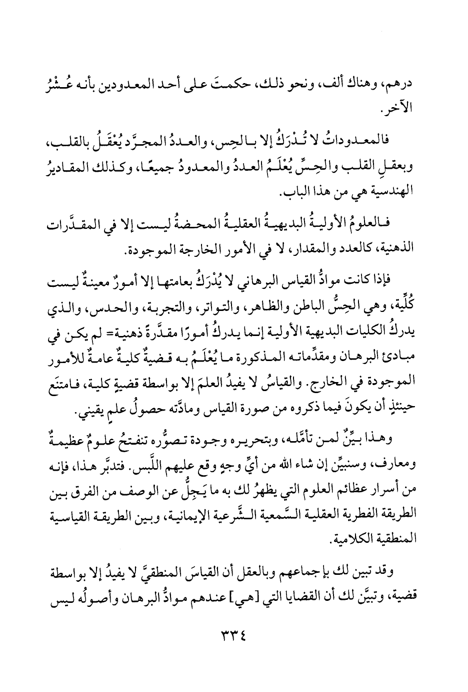 فإذا كانت موادُّ القياس البرهاني لا يُدْرَكُ بعامتها إلا أمورٌ معينةٌ ليست كُلِّية وهي الحِسُّ الباطن والظاهر والتواتر والتجربة والحدس والذي يدركُ الكليات البديهية الأولية إنما يدركُ أمورًا مقدَّرةً ذهنية لم يكن في مبادئ البرهان ومقدِّماته المذكورة ما يُعْلَمُ به قضيةٌ كليةٌ عامةٌ للأمور الموجودة في الخارج والقياسُ لا يفيدُ العلمَ إلا بواسطة قضيةٍ كلية فامتنَع حينئذٍ أن يكونَ فيما ذكروه من صورة القياس ومادَّته حصولُ علمٍ يقيني.
