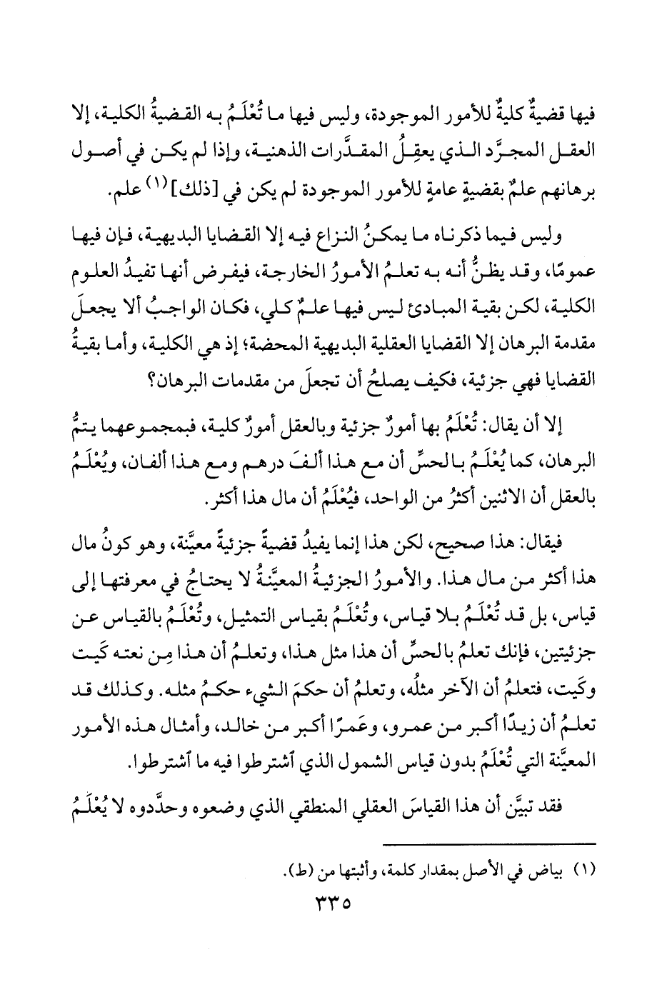 وليس فيما ذكرناه ما يمكنُ النزاع فيه إلا القضايا البديهية فإن فيها عمومًا وقد يظنُّ أن به تعلمُ الأمورُ الخارجة فيفرض أنها تفيدُ العلوم الكلية لكن بقية المبادئ ليس فيها علمٌ كلي فكان الواجبُ أن لا يجعلَ مقدمة البرهان إلا القضايا العقلية البديهية المحضة إذ هي الكلية وأما بقيةُ القضايا فهي جزئية فكيف يصلحُ أن تجعلَ من مقدمات البرهان؟