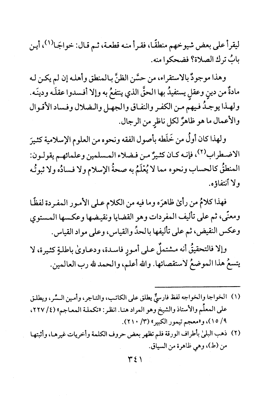 ولهذا كان أولُ من خَلَطه بأصول الفقه ونحوه من العلوم الإسلامية كثيرَ الاضطراب 2 فإنه كان كثيرٌ من فضلاء المسلمين وعلمائهم يقولون المنطقُ كالحساب ونحوه مما لا يُعْلَمُ به صحةُ الإسلام ولا فسادُه ولا ثبوتُه ولا انتفاؤه.