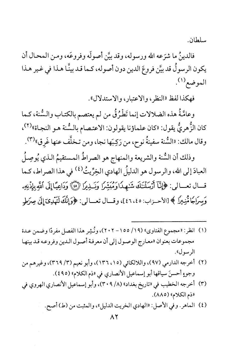 وعامَّةُ هذه الضلالات إنما تَطْرُقُ من لم يعتصم بالكتاب والسُّنة كما كان الزُّهريُّ يقول كان علماؤنا يقولون الاعتصام بالسُّنة هو النجاة 2 وقال مالك السُّنة سفينةُ نوح من رَكِبَها نجا ومن تخلَّف عنها غَرِق 3.