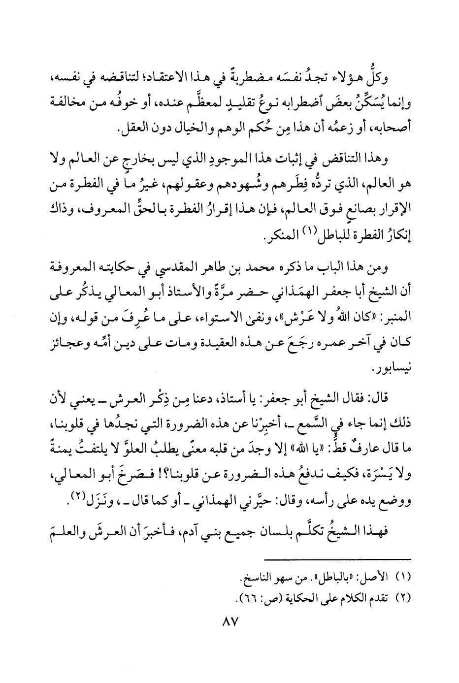ومن هذا الباب ما ذكره محمد بن طاهر المقدسي في حكايته المعروفة أن الشيخ أبا جعفر الهمَذاني حضر مرَّةً والأستاذ أبو المعالي يذكُر على المنبر كان اللهُ ولا عَرْش ونفى الاستواء على ما عُرِفَ من قوله وإن كان في آخر عمره رجَعَ عن هذه العقيدة ومات على دين أمِّه وعجائز نيسابور.