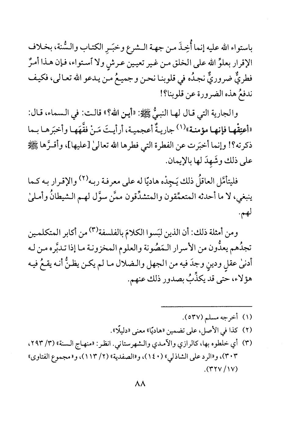 والجارية التي قال لها النبيُّ صلى الله عليه وسلم «أين الله» قالت في السماء قال «أعتِقْها فإنها مؤمنة» 1 جاريةٌ أعجمية أرأيتَ مَنْ فقَّهَها وأخبَرها بما ذكرته وإنما أخبَرت عن الفطرة التي فطرها الله تعالى [عليها] وأقرَّها النبي صلى الله عليه وسلم على ذلك وشَهِدَ لها بالإيمان.