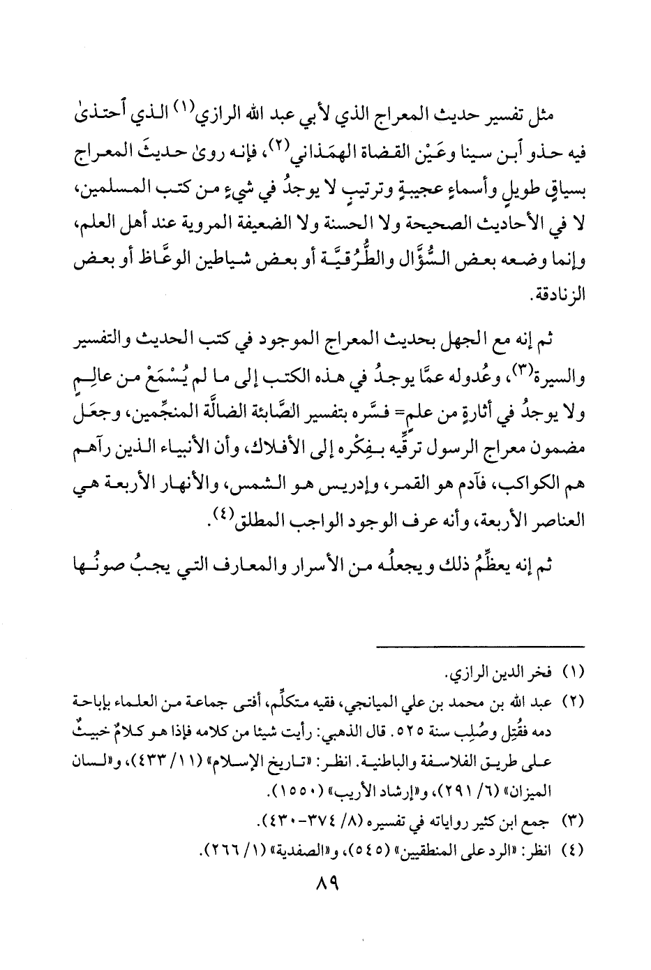 مثل تفسير حديث المعراج الذي لأبي عبد الله الرازي 1 الذي احتذى فيه حذو ابن سينا وعَيْن القضاة الهمَذاني 2 فإنه روى حديثَ المعراج بسياقٍ طويلٍ وأسماءٍ عجيبةٍ وترتيبٍ لا يوجدُ في شيءٍ من كتب المسلمين لا في الأحاديث الصحيحة ولا الحسنة ولا الضعيفة المروية عند أهل العلم وإنما وضعه بعض السُّؤَّال والطُّرُقيَّة أو بعض شياطين الوعَّاظ أو بعض الزنادقة.