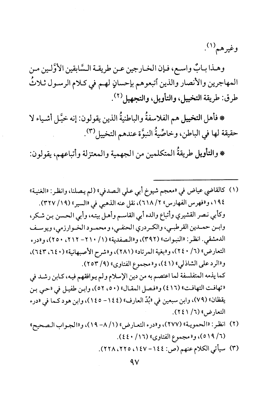 وهذا بابٌ واسع فإن الخارجين عن طريقة السَّابقين الأوَّلين من المهاجرين والأنصار والذين اتبعوهم بإحسانٍ لهم في كلام الرسول ثلاثُ طرق: طريقة التخييل والتأويل والتجهيل 2.