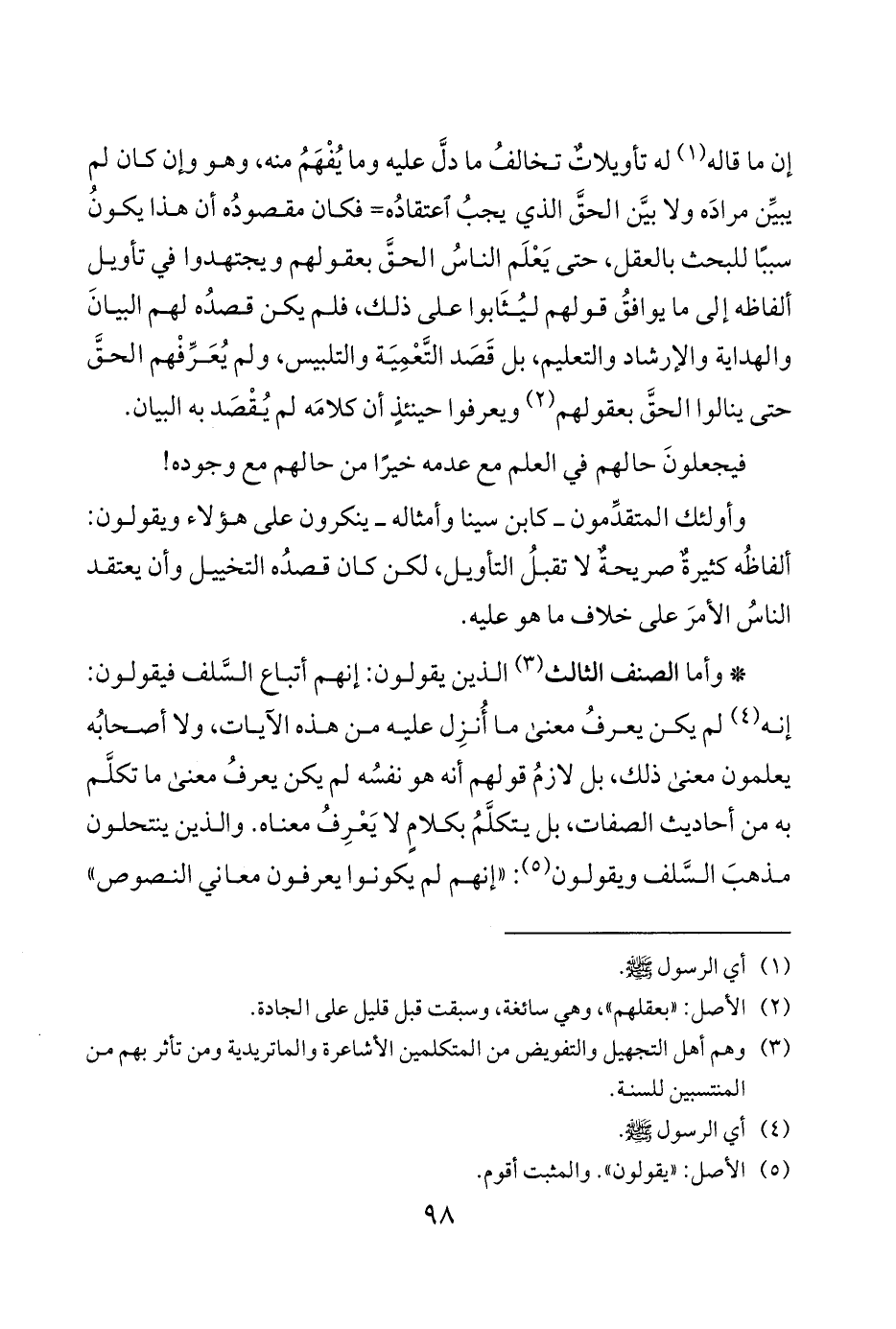 * وأما الصنف الثالث 3 الذين يقولون إنهم أتباع السَّلف فيقولون إنه 4 لم يكن يعرفُ معنى ما أُنزِل عليه من هذه الآيات ولا أصحابُه يعلمون معنى ذلك بل لازمُ قولهم أنه هو نفسُه لم يكن يعرفُ معنى ما تكلَّم به من أحاديث الصفات بل يتكلَّمُ بكلامٍ لا يَعْرِفُ معناه والذين ينتحلون مذهبَ السَّلف ويقولون 5 إنهم لم يكونوا يعرفون معاني النصوص