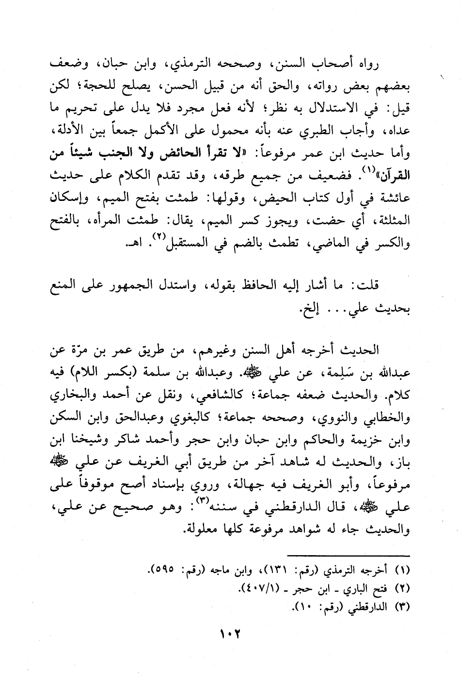 رواه أصحاب السنن، وصححه الترمذي، وابن حبان، وضعف بعضهم بعض رواته، والحق أنه من قبيل الحسن، يصلح للحجة؛ لكن قيل في الاستدلال به نظر؛ لأنه فعل مجرد فلا يدل على تحريم ما عداه وأجاب الطبري عنه بأنه محمول على الأكمل جمعًا بين الأدلة، وأما حديث بن عمر مرفوعا: «لا تقرأ الحائض ولا الجنب شيئا من القرآن». (¬1) فضعيف من جميع طرقه وقد تقدم الكلام على حديث عائشة في أول كتاب الحيض، وقولها طمثت بفتح الميم، وإسكان المثلثة، أي حضت، ويجوز كسر الميم، يقال طمثت المرأة، بالفتح والكسر في الماضي، تطمث بالضم في المستقبل. (¬2) ا. هـ.