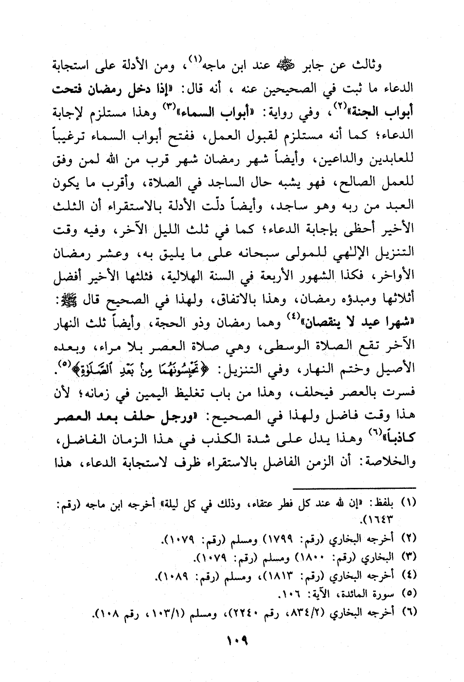 وثالث عن جابر - رضي الله عنه - عند ابن ماجة (¬1)، ومن الأدلة على استجابة الدعاء ما ثبت في الصحيحين عنه عليه الصلاة والسلام، أنه قال: «إذا دخل رمضان فتحت أبواب الجنة» (¬2) وفي رواية: «أبواب السماء» (¬3) وهذا مستلزم لإجابة الدعاء؛ كما أنه مستلزم لقبول العمل، ففتح أبواب السماء ترغيبًا للعابدين والداعين، وأيضا شهر رمضان شهر قرب من الله لمن وفق للعمل الصالح، فهو يشبه حال الساجد في الصلاة، وأقرب ما يكون العبد من ربه وهو ساجد، وأيضًا دلت الأدلة بالاستقراء أن الثلث الأخير أحظى بإجابة الدعاء؛ كما في ثلث الليل الآخر، وفيه وقت التنزيل الإلهي للمولى سبحانه على ما يليق به، وعشر رمضان الأواخر، فكذا الشهور الأربعة في السنة الهلالية فثلثها الأخير أفضل أثلاثها ومبدؤه رمضان، وهذا بالاتفاق، ولهذا في الصحيح قال - صلى الله عليه وسلم -: «شهرا عيد لا ينقصان» (¬4) وهما رمضان وذو الحجة، وأيضًا ثلث النهار الآخر تقع الصلاة الوسطى، وهي صلاة العصر بلا مراء، وبعده الأصيل وختم النهار، وفي التنزيل: {تَحْبِسُونَهُمَا مِنْ بَعْدِ الصَّلَاةِ} [المائدة: 106]. فسرت بالعصر فيحلف، وهذا من باب تغليظ اليمين في زمانه؛ لأن هذا وقت فاضل ولهذا في الصحيح: «ورجل حلف بعد العصر كاذبًا» (¬5) وهذا يدل على شدة الكذب في هذا الزمان الفاضل، والخلاصة أن الزمن الفاضل بالاستقراء ظرف لاستجابة الدعاء، هذا