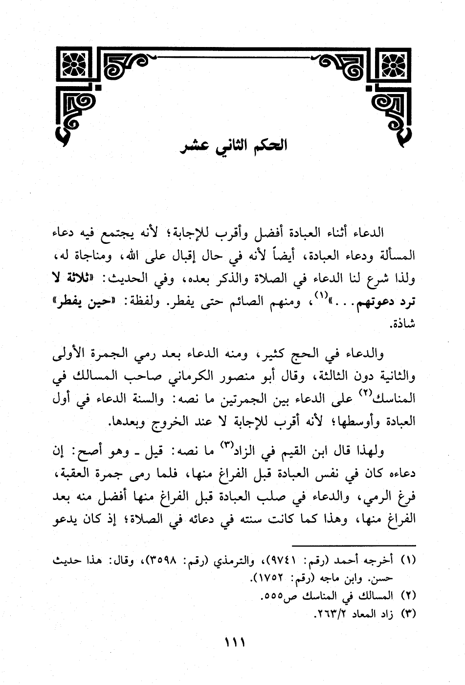 ولهذا قال ابن القيم في الزاد (¬3) ما نصه: قيل - وهو أصح: إن دعاءه كان في نفس العبادة قبل الفراغ منها، فلما رمى جمرة العقبة، فرغ الرمي، والدعاء في صلب العبادة قبل الفراغ منها أفضل منه بعد الفراغ منها، وهذا كما كانت سنته في دعائه في الصلاة؛ إذ كان يدعو